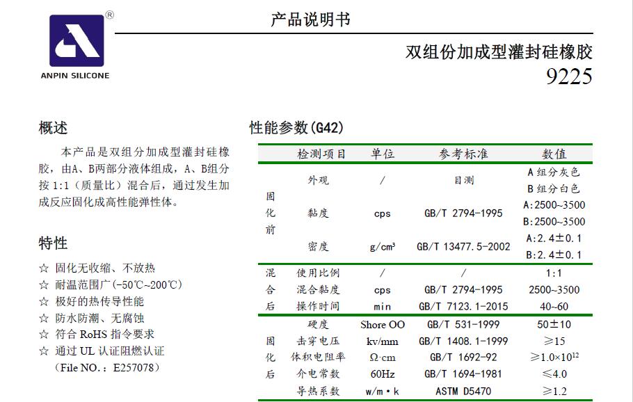 針對高密度、高集成、高功率產品發展趨勢,產品對熱管理要求越來越高,我司強勢推出9225(G42)灌封填料; 特點: 1、高導熱K=1.2~1.5w/m.k 2、低粘度高流動性3000cps 3、低硬度Shore OO:50等優越指