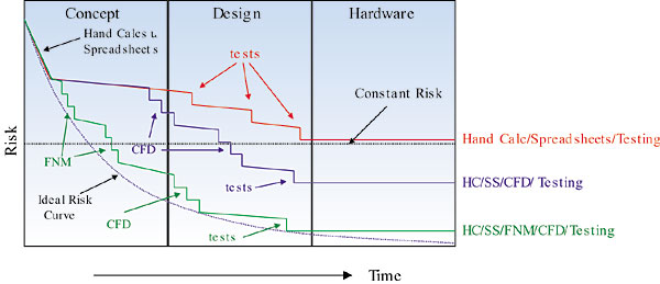 Figure 5 illustrates the importance of using the right tool at the right time. The red curve represents the risk level throughout the development cycle if only intuition, simple hand calculations and spreadsheets are used prior to testing the hardware. The green curve shows the risk level throughout the development cycle if a complete suite of tools is used. Note, in this case, the methodology approaches the ideal risk curve as a result of using the modeling technique that matches the design's fluidity.