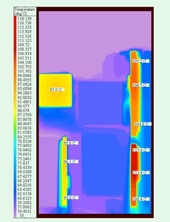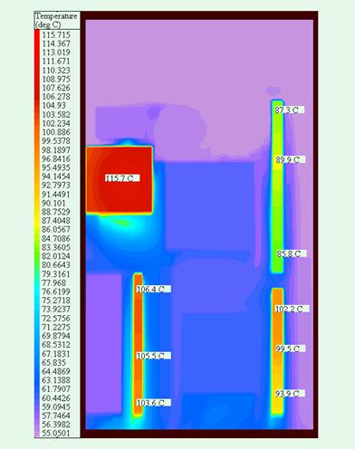 圖6、風(fēng)扇順時(shí)針旋轉(zhuǎn)時(shí)模塊截面溫度分布