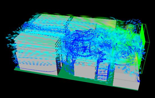 上圖為風(fēng)扇順時(shí)針方向旋轉(zhuǎn)時(shí),模塊內(nèi)部的流場分布圖。