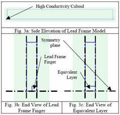 為了檢驗引線架區域采用集成近似所帶來的影響,我們將一個詳細的包有塑料外殼的引線架結構的三維描述與一個熱平衡層的三維描述進行比較。根據平面對稱性,對半個引線架構以及與之相連的半個塑料外殼進行單位逼近,再依據引線架外殼的上下對稱性,取上半部分建模。具體的幾何學及對稱條件的應用如下圖所示: