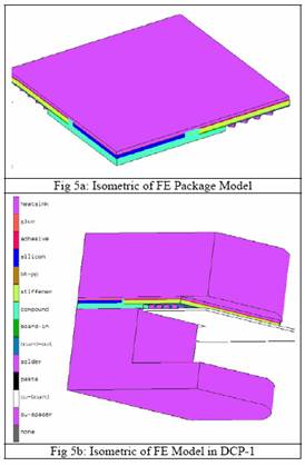 一個裸露的銅制熱嵌片,通過強熱導線連于晶片PBGA的下部,模型的幾何構型如圖5.a。這一封裝模型的組成是:一個尺寸為15.12mm* 15.12mm * 0.38mm的晶體硅通過厚85µm的膠層粘連在一個35mm* 35mm * 0.381mm的銅固定板上。晶片邊沿處的粘膠是用來粘貼BGA材料和基片的。晶片與部分BGA基片通過環氧樹脂高度粘連。封裝模型末端是靠4排間距為1.27mm的Sn63/Pb37型焊球與其它部位連接。
