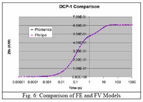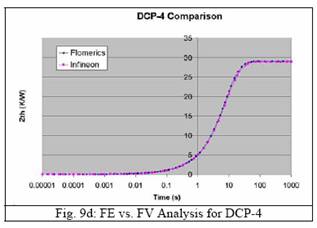 圖10和11的顯示結果表明晶片粘附層厚度和引線架縫隙對模型幾乎沒有影響,它與我們所作的基本分析的結果是一致的。圖9d顯示,DCP-4中兩條曲線的吻合性很好,引線的熱量基本被去除。圖9a至9c對DCP-1至DCP-3的描繪顯示吻合性比較不好。由于基礎研究認為出現這種情況不是在FV模型中使用假設條件建模造成的,因此這種差異很可能是兩種模型其他方面的不同所至。最顯著的不同是它們的連接桿的幾何表示不同。在FE模型中它有正確的表述,即由沖膜墊一角引出斜向插入引線架齒合面。而在FV模型中,連接桿只是簡單的從沖膜墊一角伸出與引線架相連,如圖7b所示,而不是斜向連接。然而,對比FV模型中詳盡的連接桿描述,我們將此作為一種矛盾因素,有待進一步的研究。但是,有一點應該很清楚那就是兩種模型(FV和FE)的差異要小于不同物理部件的差別。