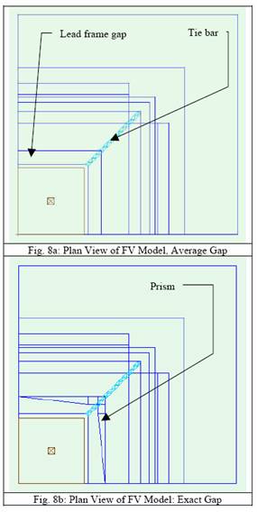 還可估計引線架插入沖模墊縫隙時不同表示方法對建模結果的影響。下面的圖表是封裝模型及其周圍銅帶的平面圖。如圖所示,沖模墊的一角通過連接桿與封裝體的一角相連。我們用兩個棱柱實現這種精確的空隙構形。