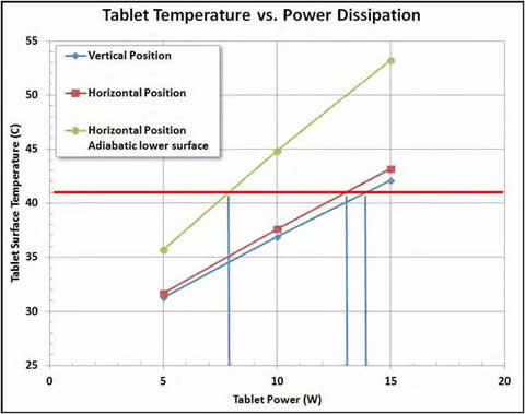 當把平板電腦垂直放置在半空中時,其各表面產生熱傳導和熱輻射,此時的理論最大散熱總功耗是13.9瓦(如圖2所示)。當把其水平放置時,最大散熱功耗下降至13.1瓦。當把其放置在水平隔熱的表面上時,熱傳遞只發生在其兩側面和前表面,此時的最大散熱功耗下降到7.9瓦,如圖3所示。這種狀況發生在平板電腦背部的熱傳遞被阻礙,如當用戶把平板電腦放置在毛毯或枕頭上時。這些數值針界定了平板電腦在靜止的空氣中所能散發的最大熱量。