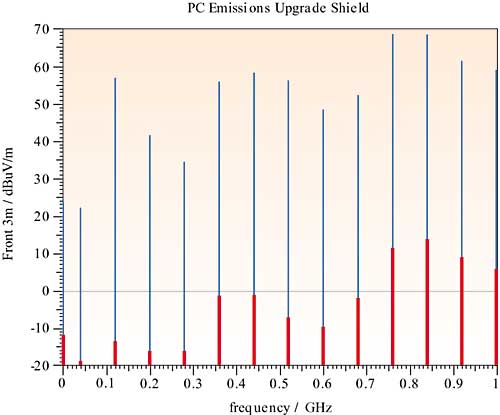 在圖4中,模擬時寬帶頻譜被時鐘頻譜加倍。將試驗結果與在無回波響應腔中取得的測試數據進行對比。盡管復位線沒有采取屏蔽措施,輻射仍在FCC的B類限制范圍之內(由216兆赫至960兆赫的允許最多衰減量為46dBuV/m)。由于在模型中沿縫處沒有電接觸,因此模擬時輻射可能擴大到700兆赫以上。