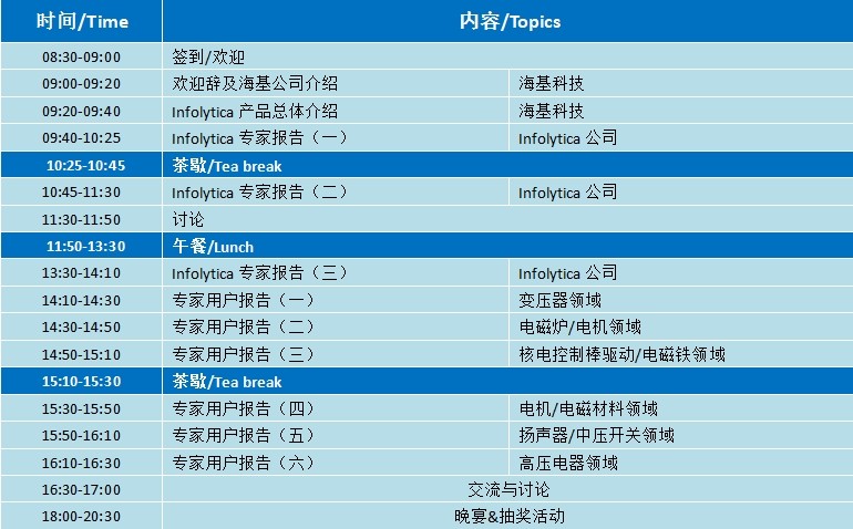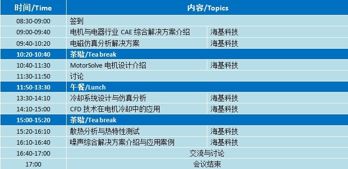在本次會議上,我們也將邀請來自變壓器、高壓電器、中壓開關、電磁爐、電磁核電控制棒驅動、電機、揚聲器、電磁材料等各領域的Infolytica專家用戶做報告,介紹他們最新研究成果,我們相信來自同行的經驗對您和我們都是不可多得的學習和交流機會!此外,為了幫助與會者更全面的解決仿真工作中常遇到的一些問題,第二天海基特別安排了“電機與電器行業仿真與設計論壇”,全程免費。屆時,工程師將為您具體講解電機與電器的電磁場仿真方案、冷卻系統設計方案、散熱解決方案及噪聲分析方案等方面內容,期待您的蒞臨。
