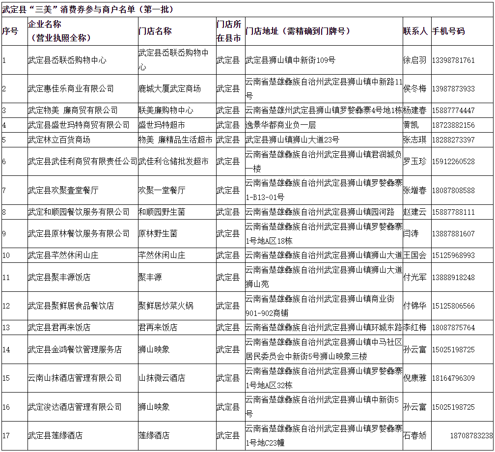 附件:武定縣“三美”消費券參與商戶名單(第一批)
