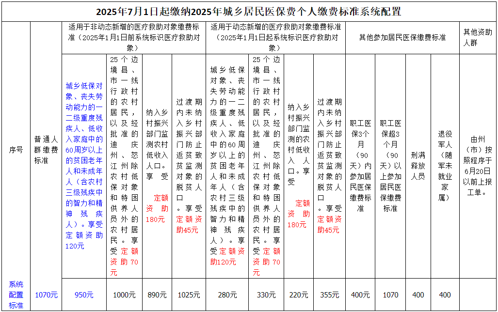 注:動態新增醫療救助對象、刑滿釋放人員、退役軍人及隨軍家屬等特殊人員限1年內享受上述繳費政策。