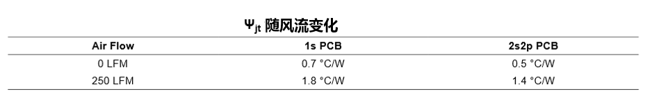 在自然對(duì)流下,塑料封裝的ΨJT通常是相對(duì)較低的值。這意味著TJ通常只比包裝頂部TT稍熱。管芯僅通過塑料封裝的薄區(qū)域與頂表面物理分離。因此,除非頂部被氣流強(qiáng)行冷卻,否則它們之間將有非常小的溫差。較薄型的封裝的自然對(duì)流ΨJT值通常小于1℃ / W。并且ΨJT值還會(huì)因周圍風(fēng)流速度的變化而發(fā)生變化。