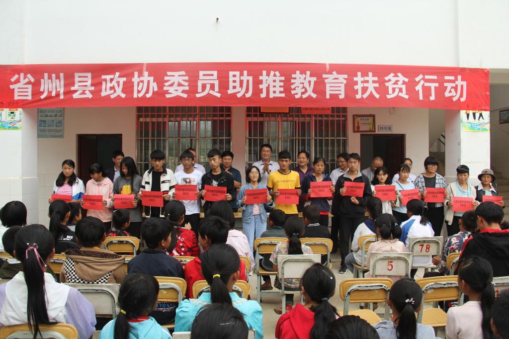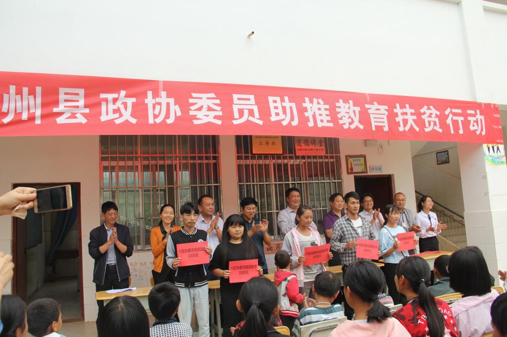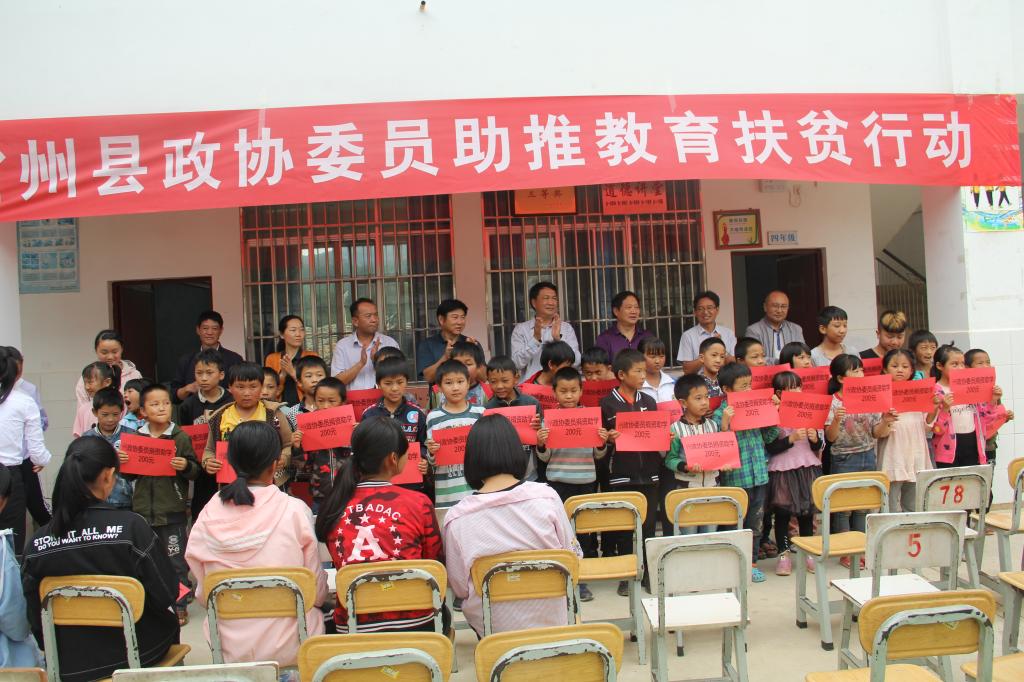 “二重大禮包”:在新村小學的院子里,早早的就來了很多學生娃娃和家長們,雖然正處暑假,但大家都非常高興,因為今天政協委員們要來為學生發“禮包”。活動當天,向8名大學生、28名高中(職高、中專)生、125名義務教育階段的小學、初中生發放了由政協委員們捐資的共47000元的助學金。州政協黨組副書記、副主席李能說:“這次捐資助學,凝聚了政協委員們對貧困地區學生的拳拳愛心,希望受助的孩子們要好好學習、勤奮自強,以自己的努力來掌握自己的命運、改變家庭現狀,掙脫貧困、共奔小康!”