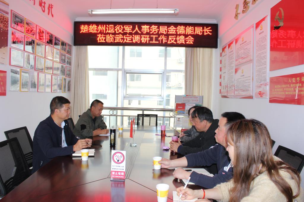 近日,楚雄州退役軍人事務局黨組書記、局長金德能一行到我縣調研指導退役軍人服務保障工作落實情況。縣退役軍人事務局局長陳選斌、副局長楊渝臣等參加調研。