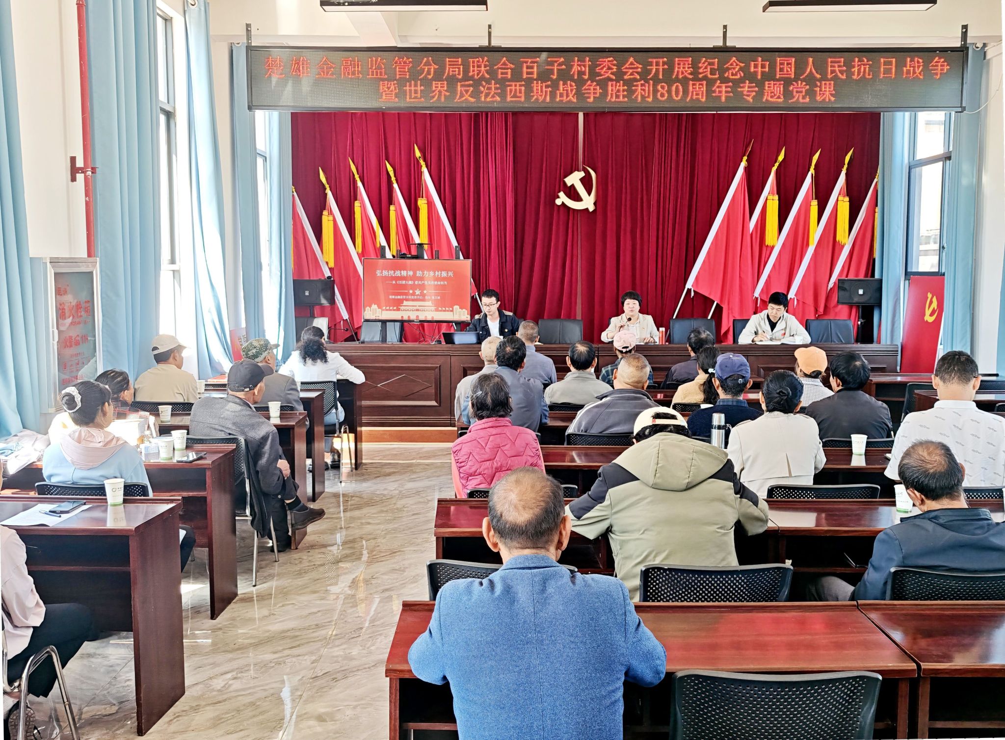 為深入學習貫徹習近平總書記在紀念中國人民抗日戰爭暨世界反法西斯戰爭勝利80周年大會上的講話精神,傳承并弘揚抗戰精神,助力百子鄉村振興工作落實落細。9月25日,楚雄金融監管分局黨委書記、局長張文凌率隊,攜副局長李桂梅及青年骨干共4人赴貓街鎮百子村,聯合百子村黨總支開展紀念中國人民抗日戰爭暨世界反法西斯戰爭勝利80周年專題黨課活動,并實地走訪慰問困難農戶。