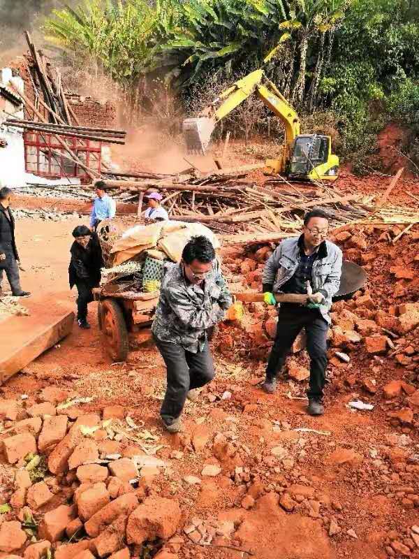 武定縣插甸鎮老木壩上、下村是典型的傈僳族聚居村,為扎實推進老木壩傈僳寨易地搬遷安置點拆舊工作和老木壩美麗鄉村項目,近日,老木壩村里無論白天黑夜,晴天雨天,幾乎每天都可以看見省委組織部駐村工作隊、鎮級工作隊、村三職、村干部、黨員群眾齊心協力拆舊房、搬東西、清理道路的場景。正可謂“工農齊歡,擼袖掃煙塵。高天滾滾不覺寒,歌聲笑語連連。更上危樓揭瓦,直搗千年陳俗。卷起殘渣碎片,換了翠水青山”