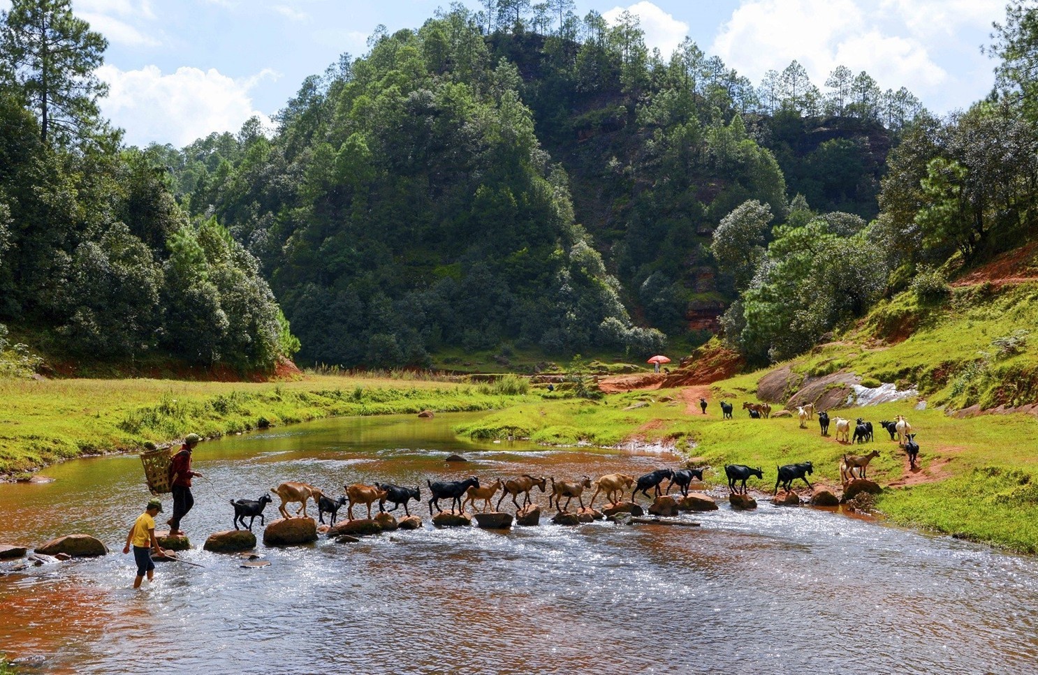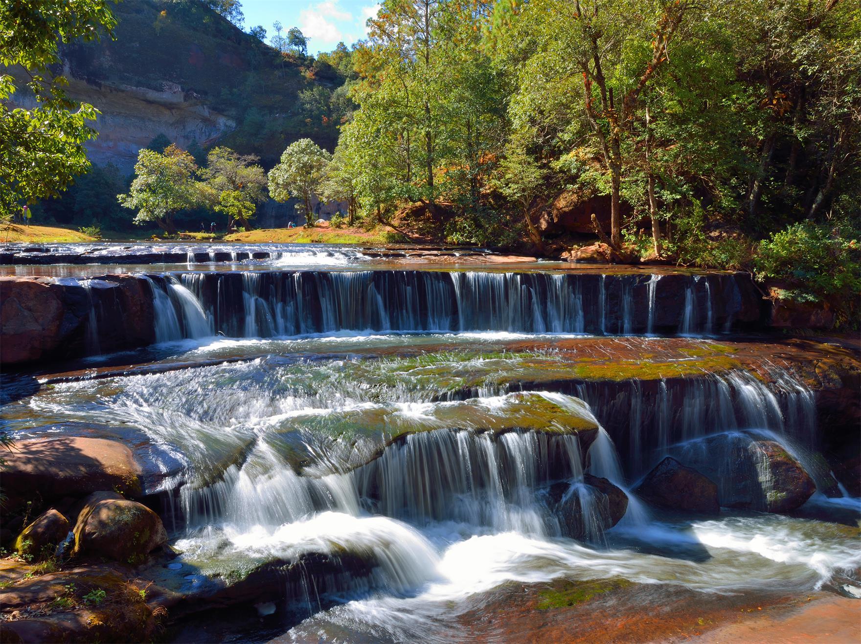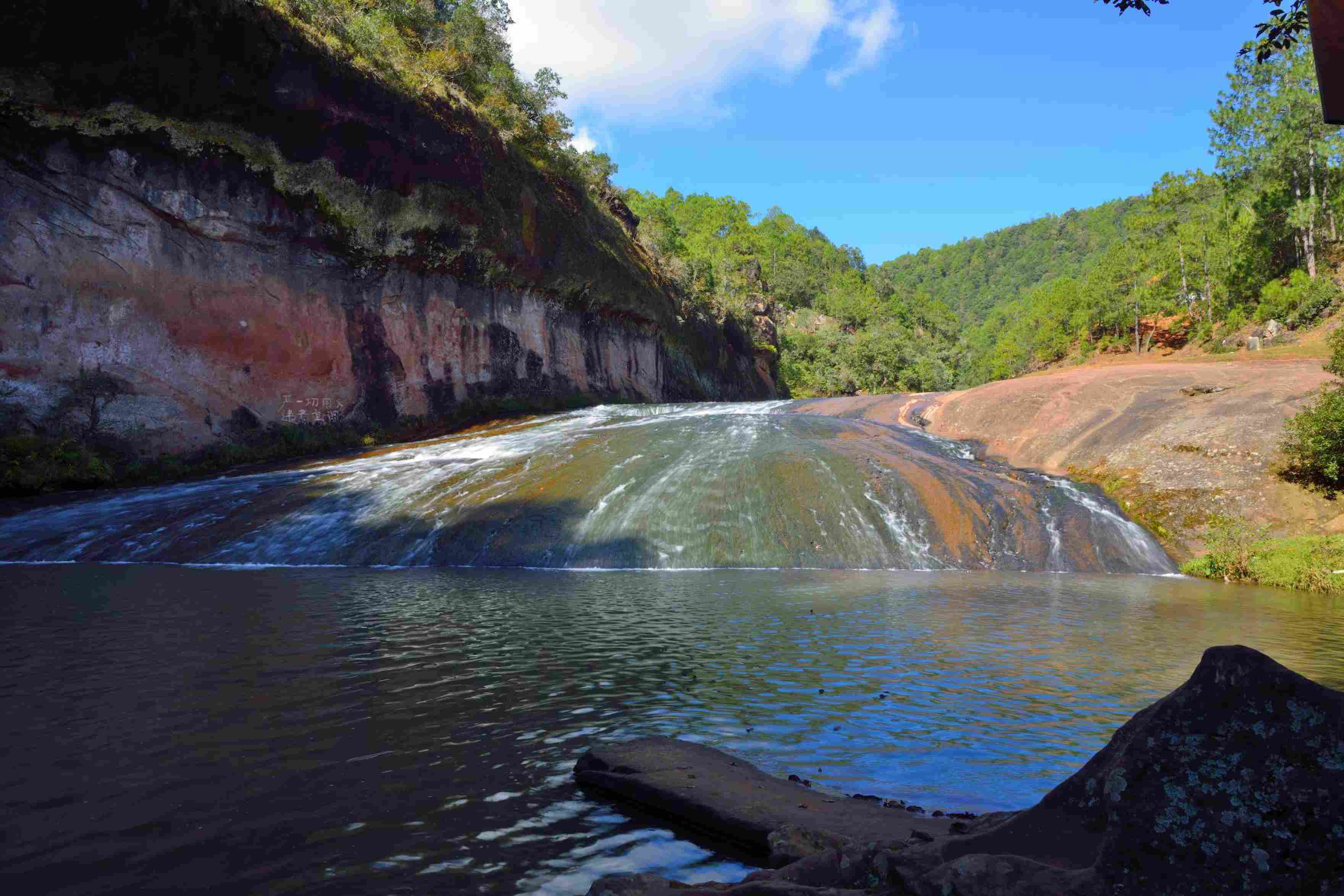 水城河位于武定縣插甸鎮水城村,流域范圍內植被茂密,生態環境良好,當地人稱水城河是“頭戴綠草帽、中間石肚翹、腳下清泉流”的絕美山水風光旅游地。大自然的天工之作,造就了水城河數道不同類型的瀑布,河床兩岸巨大奇特的紅砂巖與原生植被交融一體,形成亮麗景觀。清澈的河水在寬闊而堅硬的河床上靜靜地流淌,既有高原湖泊的明凈,也有深谷飛瀑的壯美。沿著水城河一路前行,便能邂逅絕美的山水畫卷,有溪流瀑布歡唱,高原平湖靜思,云霧高山纏繞,巨石險壑聳立,深谷村落悠然。圖為水城河瀑布。盛高義 攝