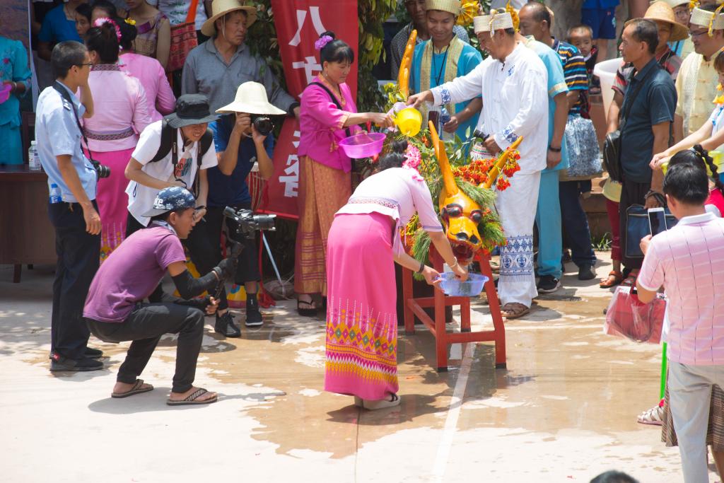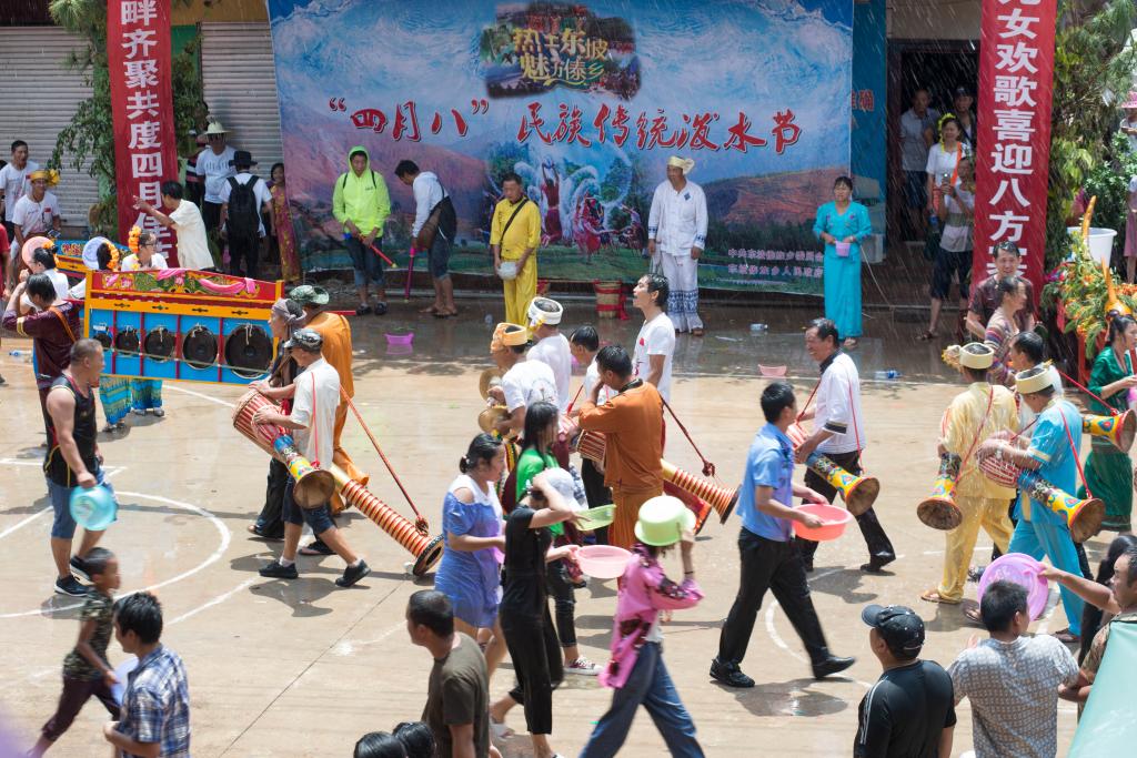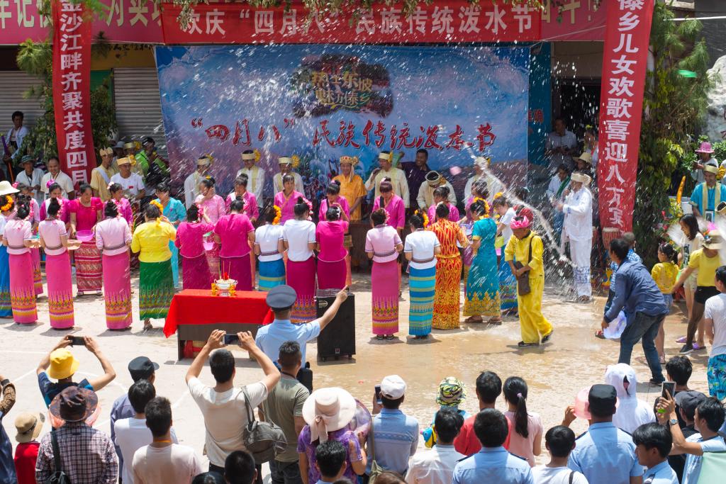 莊嚴的祈福儀式結束后,鄉黨委書記宣布開幕。現場迅速沸騰起來,潑水狂歡持續了近三個小時,人們一邊翩翩起舞,一邊呼喊“水!水!水!”,鼓鑼之聲響徹云霄,祝福的水花四處飛濺,場面十分壯觀。一群群青年男女用各種各樣的容器盛水,涌出大街小巷,追逐嬉戲,逢人便潑。“水花放,傣家狂”、“潑濕一身,幸福終身”!象征著吉祥、幸福、健康的一朵朵水花在空中盛放,人們盡情地潑盡情地灑,笑聲朗朗、全身濕透、興致彌高。和著悠揚的葫蘆絲,伴著歌舞飄揚的歡喜,給熱騰騰的東坡帶來了絲絲涼意。