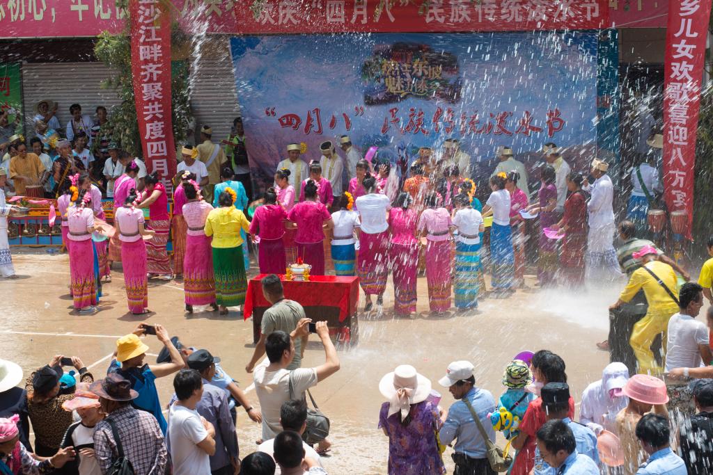 傣族潑水節又名“浴佛節”,傣語稱為“桑堪比邁”(意為新年),是傣族人民最隆重的節日,也是少數民族節日中影響面最大、參加人數最多的節日。節日一般持續3至7天。第一天傣語叫“麥日”,與農歷的除夕相似;第二天傣語叫“惱日”(空日);第三天是新年,叫“叭網瑪”,意為歲首,人們把這一天視為最美好、最吉祥的日子。節日當天,四鄰八舍攜親帶眷,傣族男女老少身著節日盛裝,從四面八方趕來共度佳節。在傣族人看來,水是圣潔、美好、光明的象征。世界上有了水,萬物才能生長,水是生命之神。一清早人們就要采來鮮花綠葉到佛寺供奉,擔來清水“浴佛”—為佛像洗塵。“浴佛”完畢,集體性的相互潑水就開始了,大家用純凈的清水相互潑灑,祈求洗去過去一年的不順。