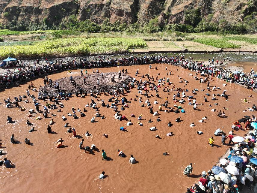 1月23日,勐果河谷陽光明媚,春意盎然。纏綿悠揚的傣族歌謠,輕盈柔美的傣族舞蹈,宏壯深沉的象腳鼓聲,清脆悅耳的排鑼鼓聲,河水中摸到魚的叫喊聲,魚兒從手中逃脫的笑聲,河岸上圍得水泄不通觀看摸魚的歡呼聲,交相輝映,響天震地,這就是勐果村大年初二一年一度的勐傣奧巴節活動現場。