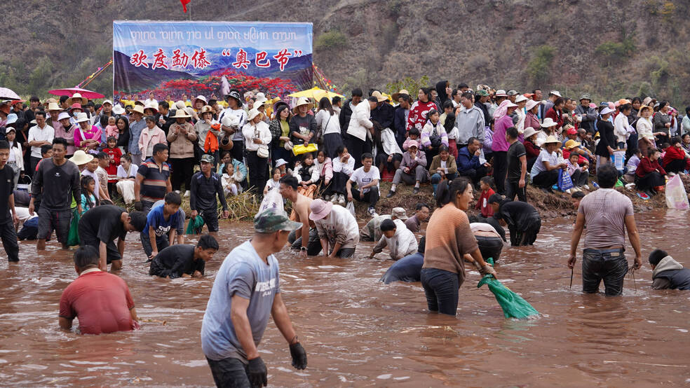 摸魚(yú)比賽是本次奧巴節(jié)的重頭戲。傣族群眾和游客朋友們拉起手袖,卷起褲腳,跳入河水中,展開(kāi)了一場(chǎng)激烈的摸魚(yú)競(jìng)技。他們或潛水尋覓,或揮網(wǎng)捕撈,各顯神通,力爭(zhēng)在規(guī)定時(shí)間內(nèi)捕捉到最大的魚(yú)。觀眾們圍在河邊,為參賽者們加油助威,歌舞聲、音樂(lè)聲、歡笑聲響徹勐果河谷上空。“渾水”摸魚(yú)比賽,各族群眾獲得了“回歸自然、親近自然”的美好體驗(yàn),讓成年人回味兒時(shí)摸魚(yú)的快樂(lè)時(shí)光,讓青少年感受“融入自然、徒手摸魚(yú)”的無(wú)窮樂(lè)趣。