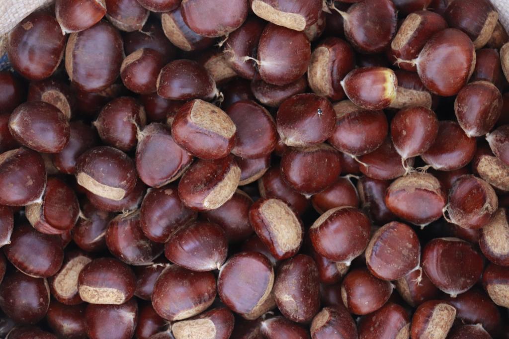 一陣風吹過,板栗園里下起了板栗雨。滿地褐紅色圓滾滾的板栗安靜地躺在地上,等待著栗農把它們帶回家。栗農們每天都會打上200—300斤,打板栗、撿板栗、給板栗去殼,忙得不亦樂乎。