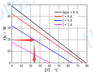 芯片溫度控制在26℃,則溫升要求為24℃。通過規格書中的制冷量、電流、溫差圖,獲知工作電流應為4A: