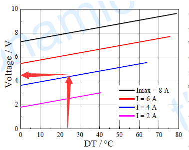 此處4A的電流,指的是TEC工作穩定之后的電流,啟動時,工作電流稍大。在某些TEC規格書中還提供有電壓、電流和溫差線圖,此時,可以在此圖中將對應的電壓線找到,并使得溫差為零(初始狀態,冷熱面溫差為零),回溯獲得初始電流值。如果規格書中并未提供此圖,則通常按照穩態電流值的~1.2倍設置。