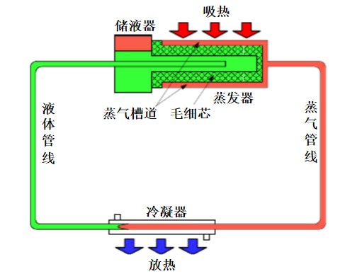 也就是說,這里使用的手段,應該類似我們常說的環路熱管(Loop Heat Pipe,LHP)。LHP在傳統熱管的基礎上發展而來,它繼承了傳統熱管的優點,同時克服了傳統熱管的固有缺陷和不足。LHP與傳統熱管最顯著的區別為毛細結構的局部化設置,它只在蒸發器吸熱區域布置毛細芯,將傳統熱管毛細芯的毛細抽吸功能與液體回流功能分離。對于LHP,液體經過光滑內壁管線回流,流動壓降顯著降低,因而可采用能提供很高毛細壓力的微米級孔徑毛細芯來克服重力的影響,同時不會產生增加液體回流阻力的負面影響。