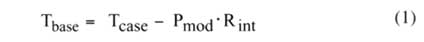 為了選擇合適的散熱器,熱設(shè)計首先要確定散熱器的最大設(shè)計熱阻。要得到這一數(shù)值必須知道芯片的最大殼溫,Tcase,芯片的熱功耗,Pmod,以及芯片與散熱器的接觸熱阻,Rint。散熱器底面的最高溫度Tbase,可由以下公式給出: