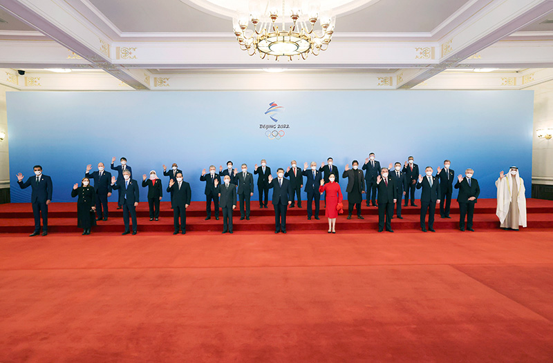 2月5日中午,國家主席習近平和夫人彭麗媛在北京人民大會堂金色大廳舉行宴會,歡迎出席北京2022年冬奧會開幕式的國際貴賓。這是習近平和彭麗媛同國際貴賓一起合影留念。新華社記者 謝環馳 攝