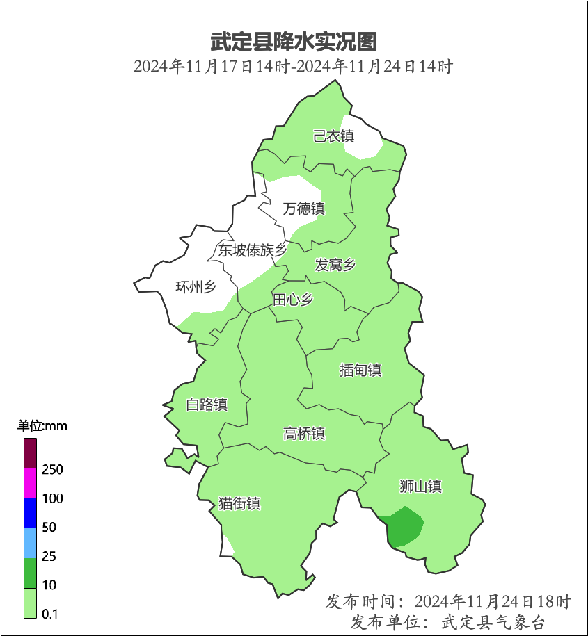 2024年11月17日14時~11月24日14時,統計全縣27個自動氣象站資料,全縣平均降雨2.6毫米,其中無降雨6站,10.0毫米以下20站,10.0~25.0毫米1站,最大降雨量出現在獅山鎮羊舊11.8毫米。各鄉(鎮)降雨量(毫米):獅山6.0、高橋3.2、貓街3.1、插甸2.3、白路3.2、田心1.1、發窩3.4,其中環州、東坡、萬德、己衣無降雨。