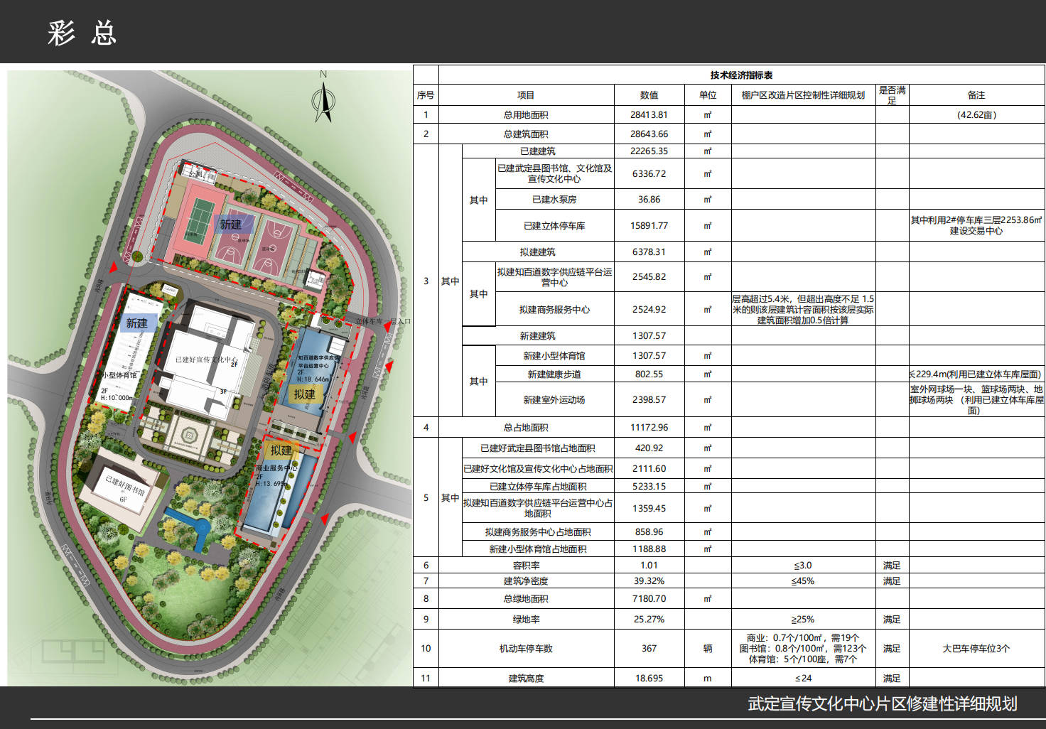 武定縣人民政府委托云南人防建筑設(shè)計(jì)院有限公司編制了《武定縣宣傳文化中心片區(qū)修建性詳細(xì)規(guī)劃》,項(xiàng)目規(guī)劃主要技術(shù)經(jīng)濟(jì)指標(biāo)如下: