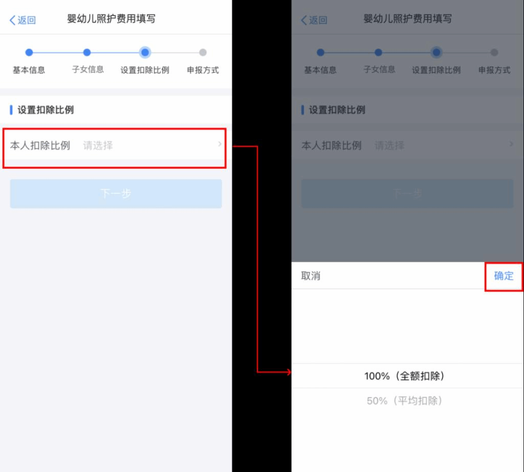 第四步,設(shè)置扣除比例。完成子女信息填寫后,納稅人根據(jù)實(shí)際情況在“本人扣除比例”中選擇100%(全額扣除)或50%(平均扣除)其中一種。選擇完成并確定后,點(diǎn)擊“下一步”。