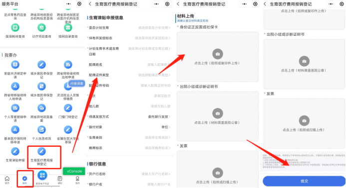 2、點擊【服務(wù)】進(jìn)入辦理頁面,點生育醫(yī)療費用報銷登記;填寫申報信息,帶“*”項為必填項,置灰項根據(jù)已有信息自動導(dǎo)入,不能填寫,只能查看,其他為選填;點擊【提交】可以提交保存填寫的生育津貼申報信息。