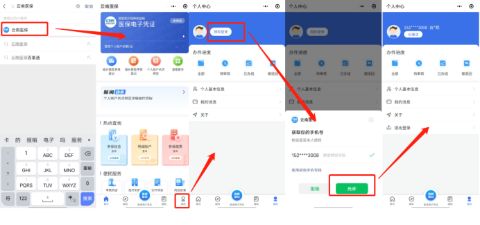 1、微信搜索“云南醫(yī)保”==>點我的==>跳出授權(quán)登錄==>授權(quán)登錄成功。