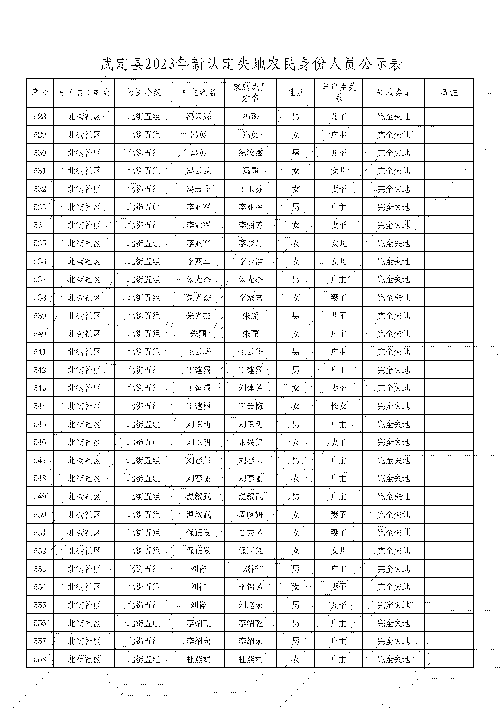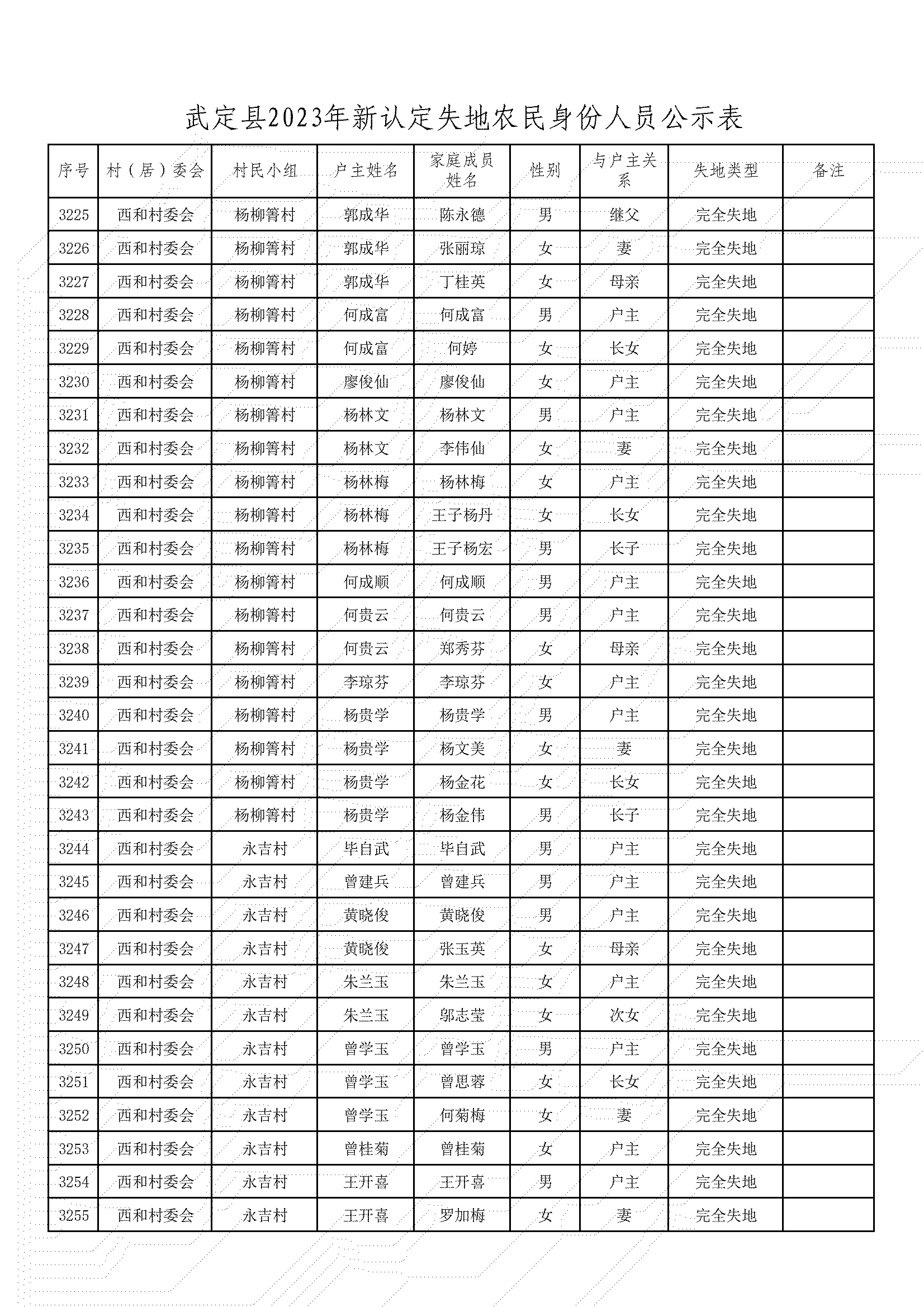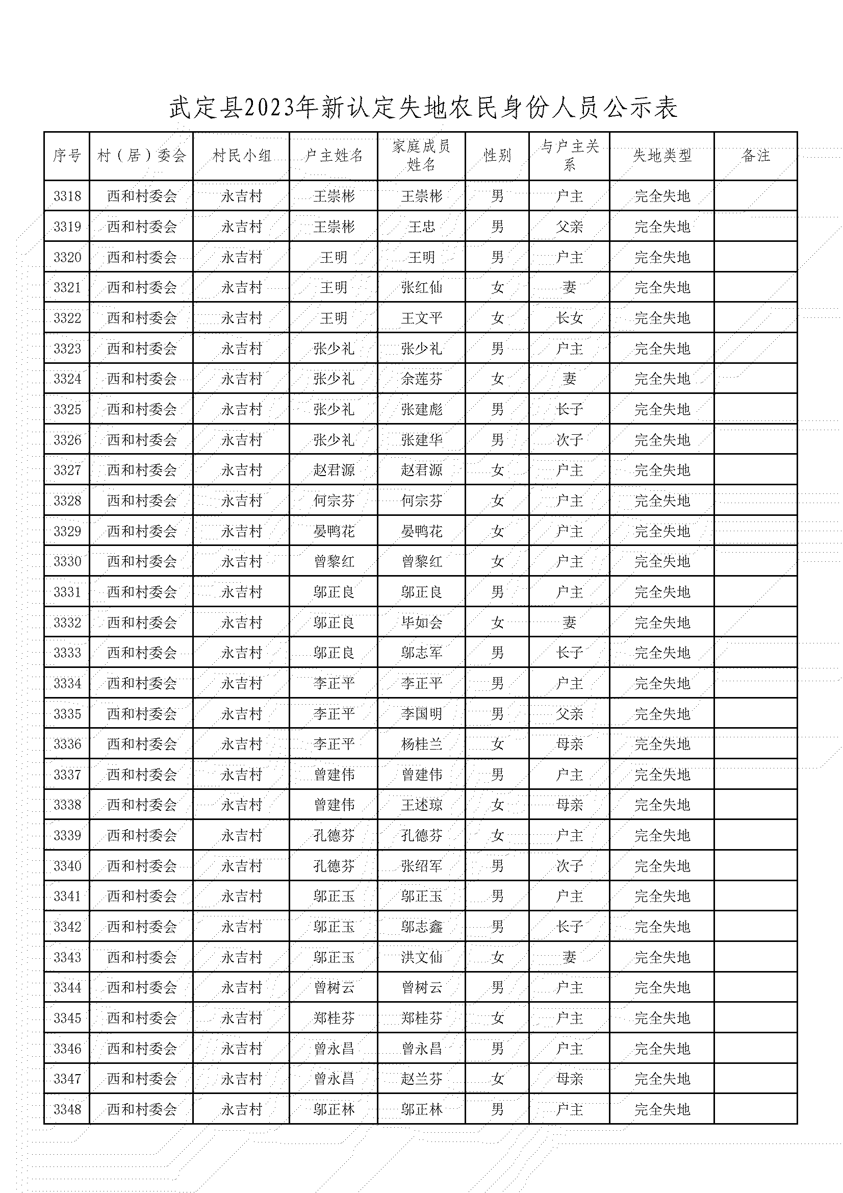 根據《武定縣人民政府辦公室印發武定縣改革完善被征地農民基本養老保障工作實施辦法的通知》(武政辦發〔2020〕6號)文件精神,經村(居)委會、獅山鎮、縣公安局、縣自然資源局、縣農業農村局、縣人社局對被征地農民土地征收、戶籍人口、參加基本養老保險等情況進行審核,現將2023年符合認定為被征地農民身份的人員予以公示,接受社會監督。公示期從2023年12月18日至2023年12月22日,共5天。公示期間,如對公示對象有異議,請向武定縣人力資源和社會保障局社會保險中心反映。