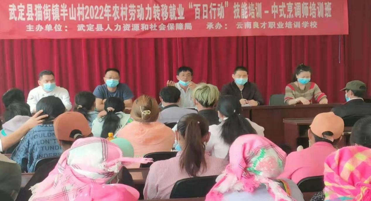為進一歩鞏固拓展脫貧攻堅成果,推進鄉村振興發展工作,近日武定縣人力資源和社會保障局委托云南良才職業培訓學校分別在貓街鎮秧草地村委會、半山村委會和三家村委會舉行了2022年農村勞動力轉移就業“百日行動”(家畜飼養.中式烹調師,家政服務)等技能培訓班。