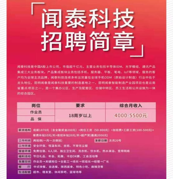 上班工作時間:早上7:30—19:30,兩班倒。活輕松簡單,主要操作機臺,不穿無塵服可帶手機。員工17元/小時,計薪10.5小時,月工時300以上。月綜合工資6000左右,每月30號發工資。