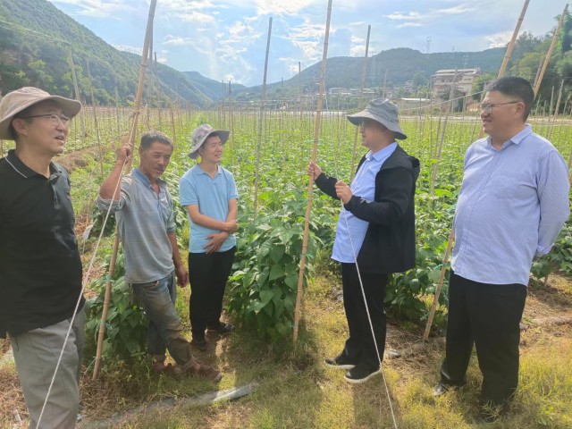 8月5日,調研組到獅山鎮下古柏村調研鮮食豌豆和鮮食蕓豆的新品種示范和生產,期間詳細了解了當地食用豆生產情況,針對生產實際為種植戶提出了?;ūGv葉面肥施用方案及高溫高濕環境下病蟲害預防和治理建議。隨后調研組前往插甸鎮康照村委會七棵樹村進行多花菜豆的生產調研和現場指導,考察了安德村委會路普里干村多花菜豆、鮮食豌豆的生產情況并與種植大戶就多花菜豆生產過程中田間牽蔓搭架改良方法、田間肥水管理以及當前階段可能發生的病蟲害的有效預防策略進行了詳細交流并提出解決方案。
