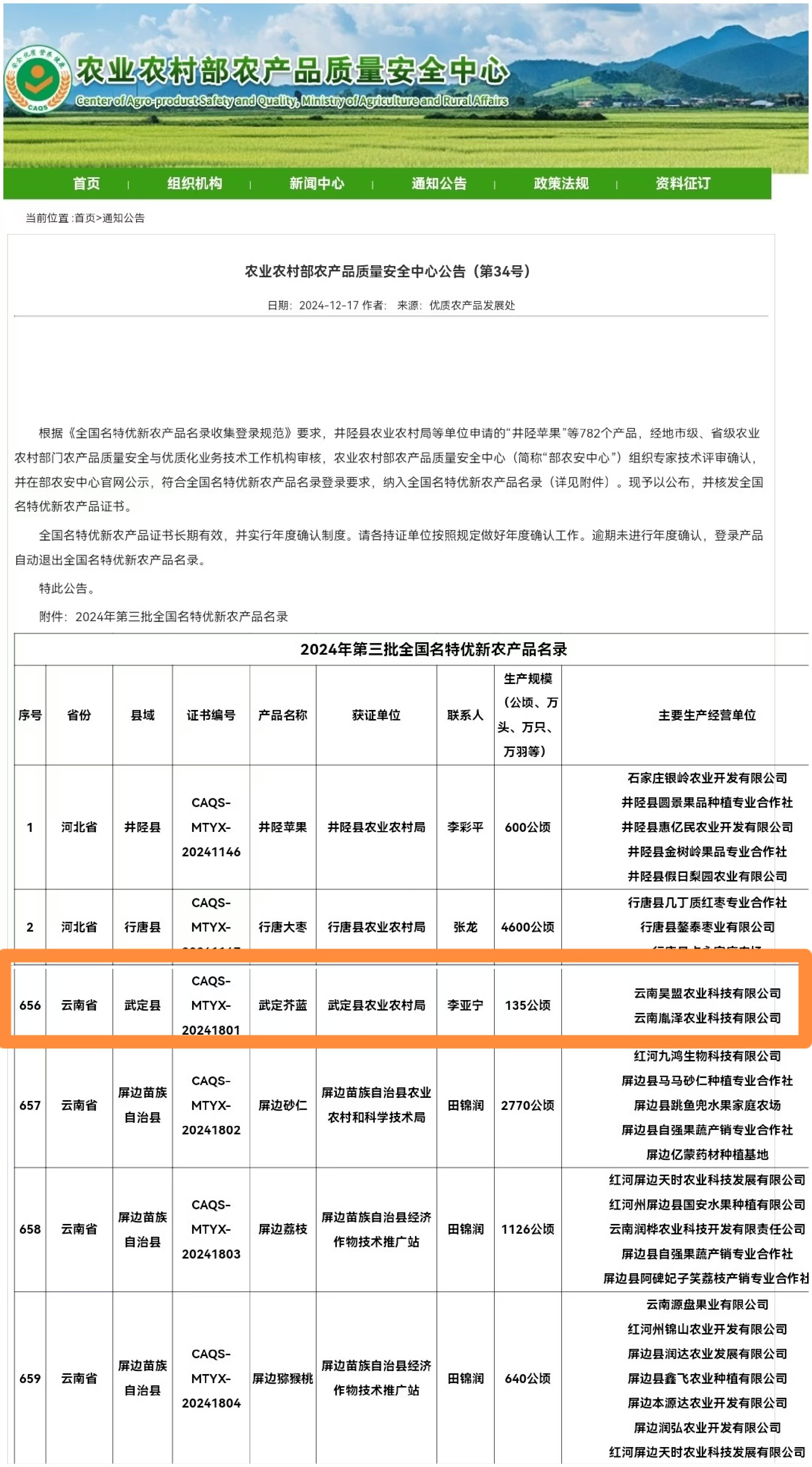 近日,農業農村部農產品質量安全中心第34號公告發布,公布2024年第三批全國名特優新農產品名錄,武定芥藍榜上有名,列入全國名特優新農產品。