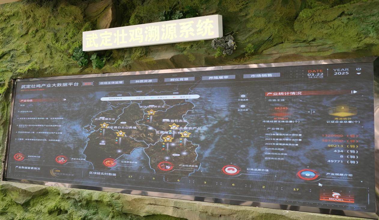 在文化傳承區,投影屏幕重現明清時期“貢雞進京”的歷史場景以及家禽起源的歷史演變過程。產業創新區則搭建起覆蓋全產業鏈的智慧平臺:溯源系統可實時追蹤每只雞的成長軌跡。在產業園內,還設置了農特產品展示區,除11個鄉鎮以及行業協會在此展示核桃、芒果、鮮切花等上百種獨具地方特色的農特產品及非遺手工藝品外,首羽、臻驥、武獅等武定壯雞行業龍頭企業還展出了各自的武定壯雞系列產品,極大地吸引了廣大群眾的眼球。