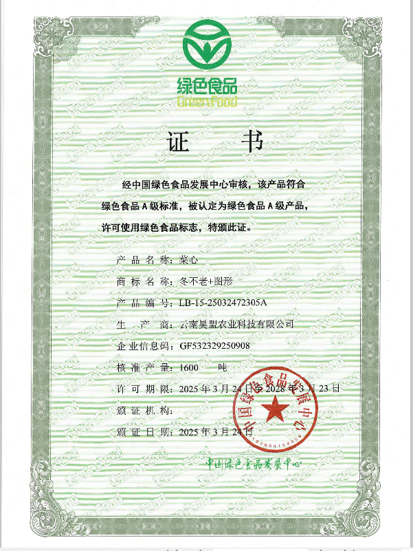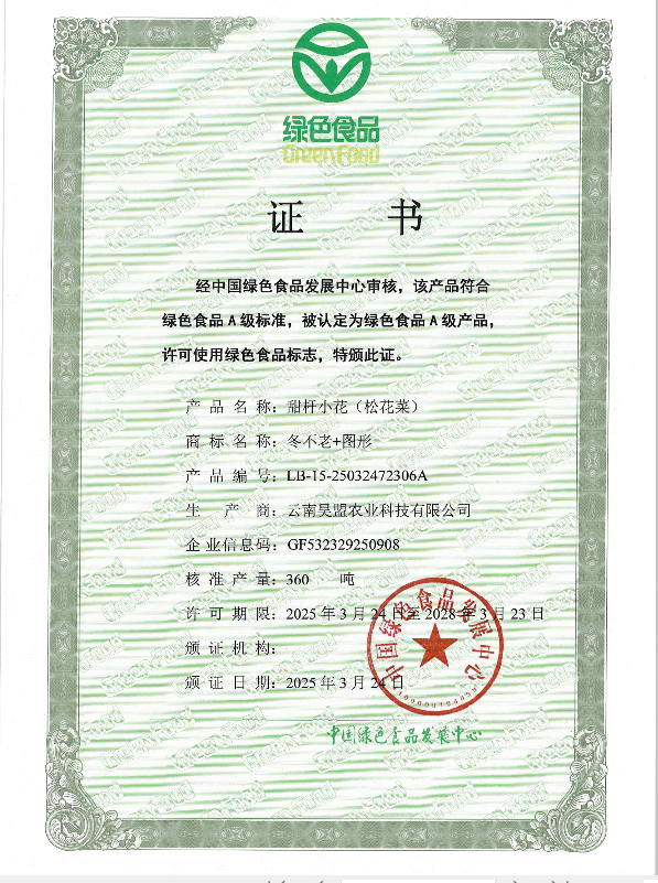 近日,云南昊盟農業科技有限公司申報的菜心、芥藍、西蘭花薹、甜桿小花(松花菜)等四個產品正式取得中國綠色食品發展中心頒發的綠色食品證書,通過綠色食品認證。