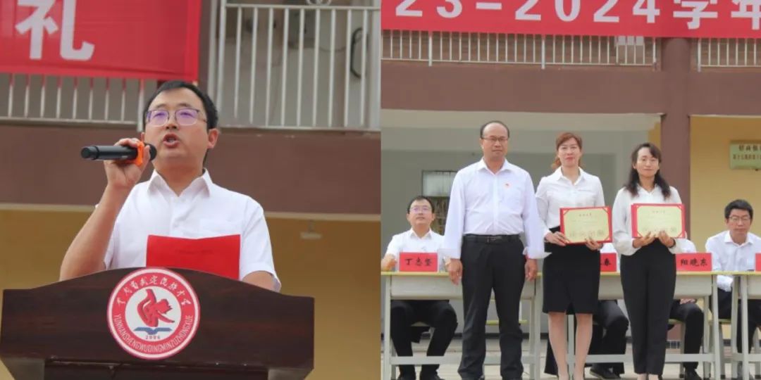 丁志堅副校長宣讀獲獎教師名單,我校李沁娜老師和尹太美老師在第十二屆全國初中語文教師教學基本功大賽中取得優異成績,張平校長為獲獎教師頒發榮譽證書。