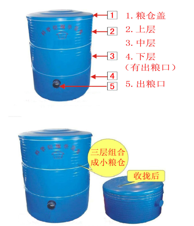 “小糧倉”用優質彩鋼板材料制造,由上、中、下3個圓筒形倉圈組裝而成,高1.35米,直徑1.2米,下層有一個出糧口,供取糧時使用,倉體拆裝方便,具有科學、環保、衛生、防鼠、防蟲、防霉和占地面積小、使用靈活,不易生銹、經久耐用、占空間小,外形美觀、能疊加、便于收藏、運輸等特點,使用壽命達15年,單倉有效倉容為1000公斤,可存放多個品種糧食;單倉造價約為500元左右,由農戶自主選擇購買。