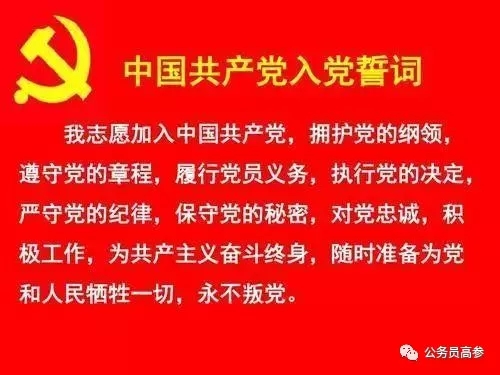 58.入黨誓詞:我志愿加入中國共產黨,擁護黨的綱領,遵守黨的章程,履行黨員義務,執行黨的決定,嚴守黨的紀律,保守黨的秘密,對黨忠誠,積極工作,為共產主義奮斗終身,隨時準備為黨和人民犧牲一切,永不叛黨。