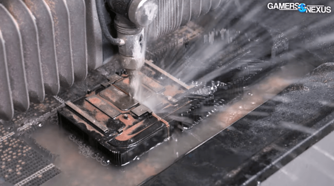 用水刀將GeForce RTX 4090 的均熱板散熱器切成兩半(來源:Gamers Nexus)