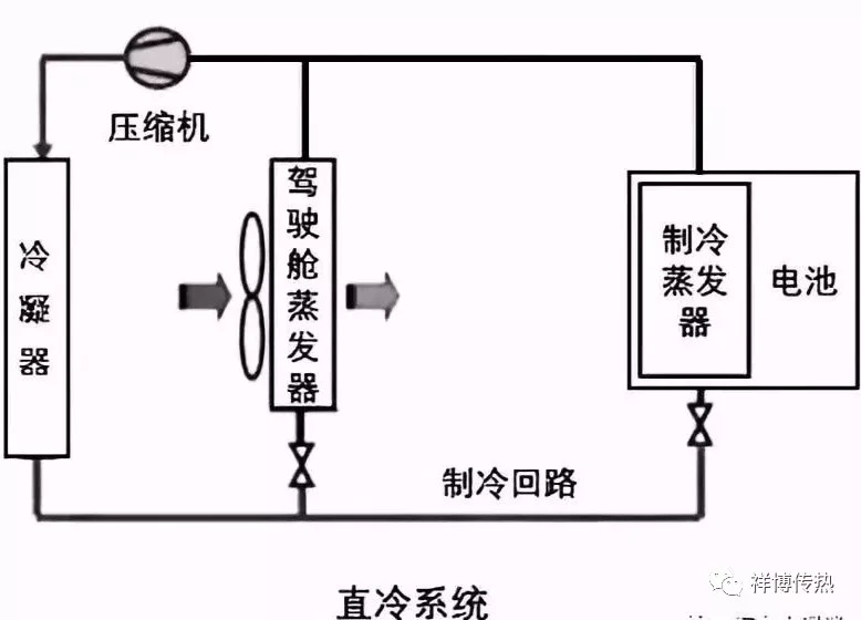 直冷系統(tǒng)具有系統(tǒng)緊湊、重量輕以及性能好的優(yōu)點。但是此系統(tǒng)是一個雙蒸發(fā)器系統(tǒng)、系統(tǒng)沒有電池制熱、沒有冷凝水保護、制冷劑溫度不易控制且制冷劑系統(tǒng)壽命短。目前通過直冷的冷卻方式基本在電動乘用車上,最典型的如BMW i3(i3有液冷、直冷兩種冷卻方案)。